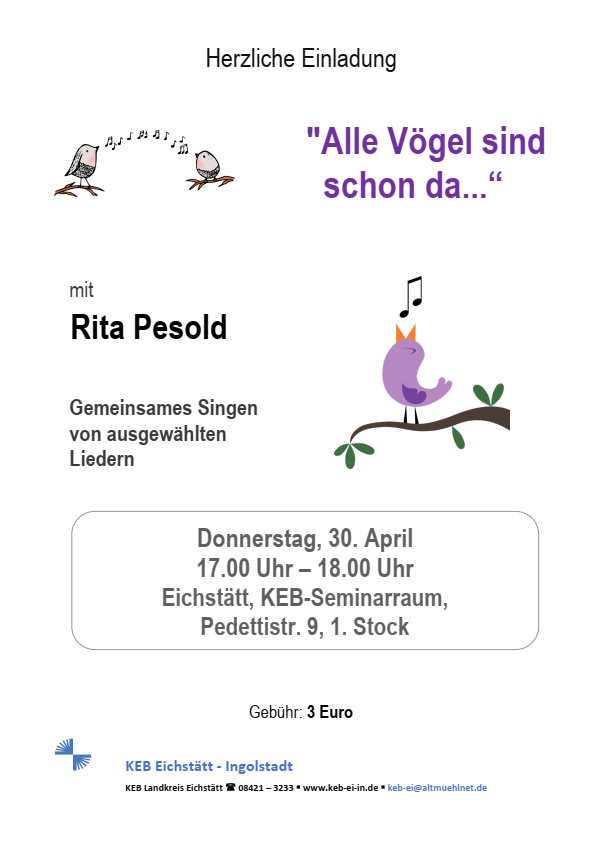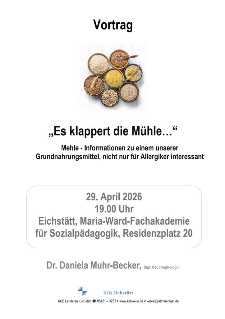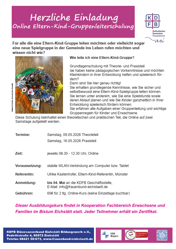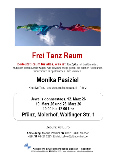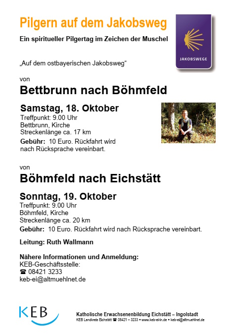 Katholische Erwachsenenbildungim Landkreis Eichstätt e.V.Pedettistraße 985072 Eichstätt Telefon: 08421/3233Fax: 08421/3286Internet: www.keb-eichstaett.deE-Mail: keb-ei(at)altmuehlnet.de