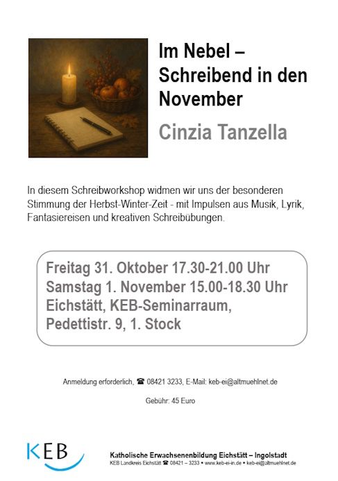 In diesem Schreibworkshop widmen wir uns der besonderen Stimmung der Herbst-Winter-Zeit - mit Impulsen aus Musik, Lyrik, Fantasiereisen und kreativen Schreibübungen.