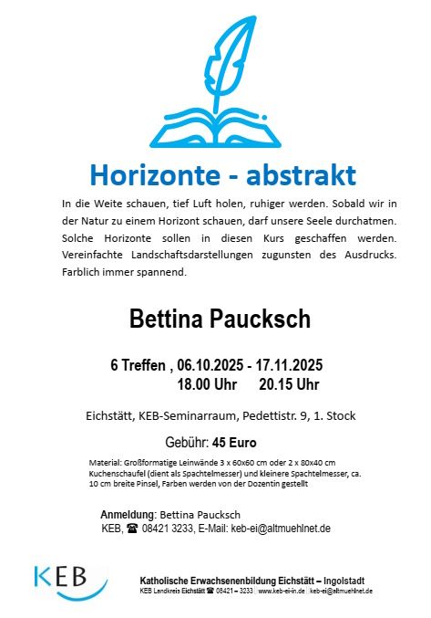 In die Weite schauen, tief Luft holen, ruhiger werden. Sobald wir in der Natur zu einem Horizont schauen, darf unsere Seele durchatmen. Solche Horizonte sollen in diesen Kurs geschaffen werden. Vereinfachte Landschaftsdarstellungen zugunsten des Ausdrucks. Farblich immer spannend.